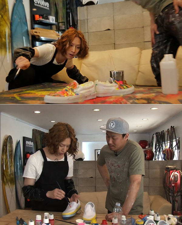 오늘(26일) 방송되는 KBS 2TV 글로벌 인터랙티브 쇼 '어 스타일 포 유(A Style For You)'에서는 4MC들이 자신만의 스타일로 커스텀 아이템을 제작한다. 이에 김희철은 페인팅 운동화 만들기에 도전, 마치 팝아티스트 앤디워홀을 연상시키며 그만의 독특한 취향을 커스텀 아이템에 그려냈다.