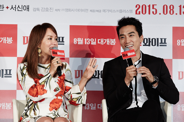 영화 '미쓰 와이프'는 승률 100% 에이스 변호사가 어느 날 사고를 당해 하루아침에 애 둘 딸리고 쓸데없이 잘생긴 남편이 있는 주부로 한 달을 살게 되며 겪는 코미디이다. 엄정화가 주부로 바뀐 변호사 역이고 송승헌은 생활력 강한 구청공무원 역을 맡았다. 어제(13일) 서울 메가박스 동대문에서는 강효진 감독과 두 주연배우가 참석한 가운데 제작보고회가 열렸다.