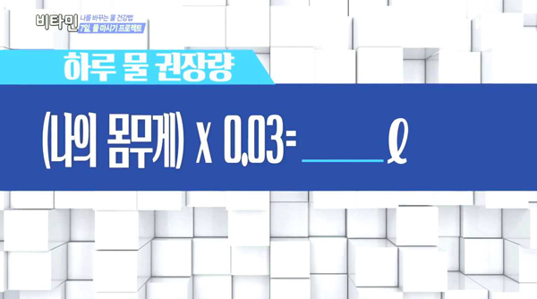 어제(19일) 방송된 KBS 2TV '비타민'에서는 '나를 바꾸는 물 건강법'에 대해 알아봤다. 성인기준, 배출되는 수분의 양은 2.6L 그리고 음식과 과일로 채워지는 수분은 1L로 알려져있다. 이에 몸의 70%를 수분으로 채워야하는데, 이때 하루에 먹어야 할 수분 섭취량이 따로있다. 즉, <(나의 몸무게)X 0.03 >이란 공식을 적용하면 자신이 하루에 먹어야 할 수분 섭취량이 나온다.
