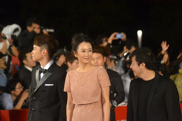어제(1일) 부산 해운대구 우동 영화의 전당에서 열린 제 20회 부산국제영화제 개막식에 참석한 중국영화감독 지아장커(가장가)와 이 영화에 출연한 배우 자오타오(조도)와 둥쯔지엔(동자건)이 레드카펫 무대에서 포즈를 취하고 있다. 올 영화제 기간에는 부산국제영화제와 깊은 인연을 갖고 있는 지아장커 감독의 신작 '산하고인'이 상영된다.