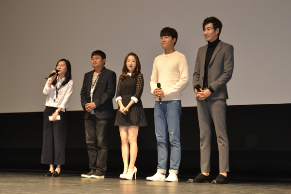 어제(3일) 오후, 부산 해운대구 소향씨어터 센텀시티에서 영화 '돌연변이' 상영 뒤 열린 GV(관객과의 대화)에 참석한 권오광 감독과 주연배우 박보영, 이천희, 이광수가 무대인사를 하고 있다.