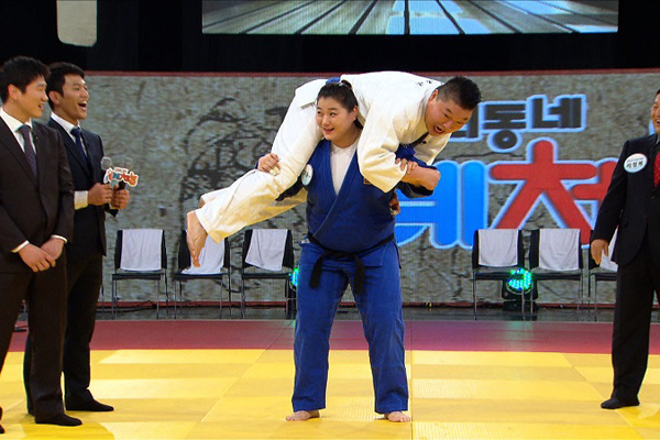 여자유도 김지윤 선수가 강호동을 들쳐 메 눈길을 사로잡고 있다.