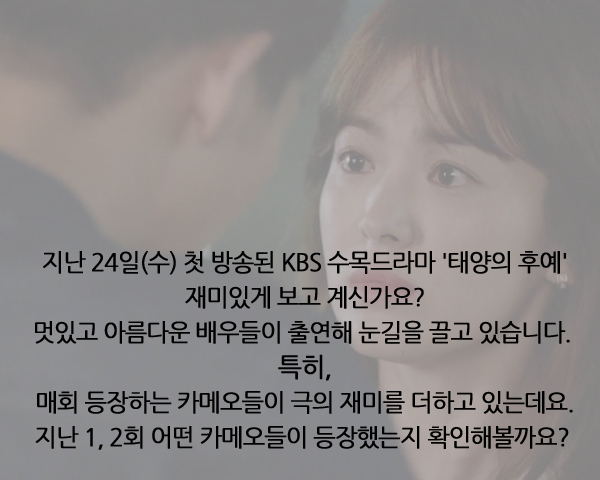 지난 24일(수) 첫 방송된 KBS 2TV 수목드라마 '태양의 후예'가 시청자들의 많은 사랑을 받고 있다. 첫 회부터 송중기와 친분이 있는 이광수가 카메오로 출연했으며 2회에서는 KBS 정지원, 박태원 아나운서가 '강모연(송혜교 분)의 바디-젝'이란 프로그램의 MC로 등장하기도 했다. 또한 송중기의 전우로 배우 이종혁이 짧지만 강한 인상을 남겼다.