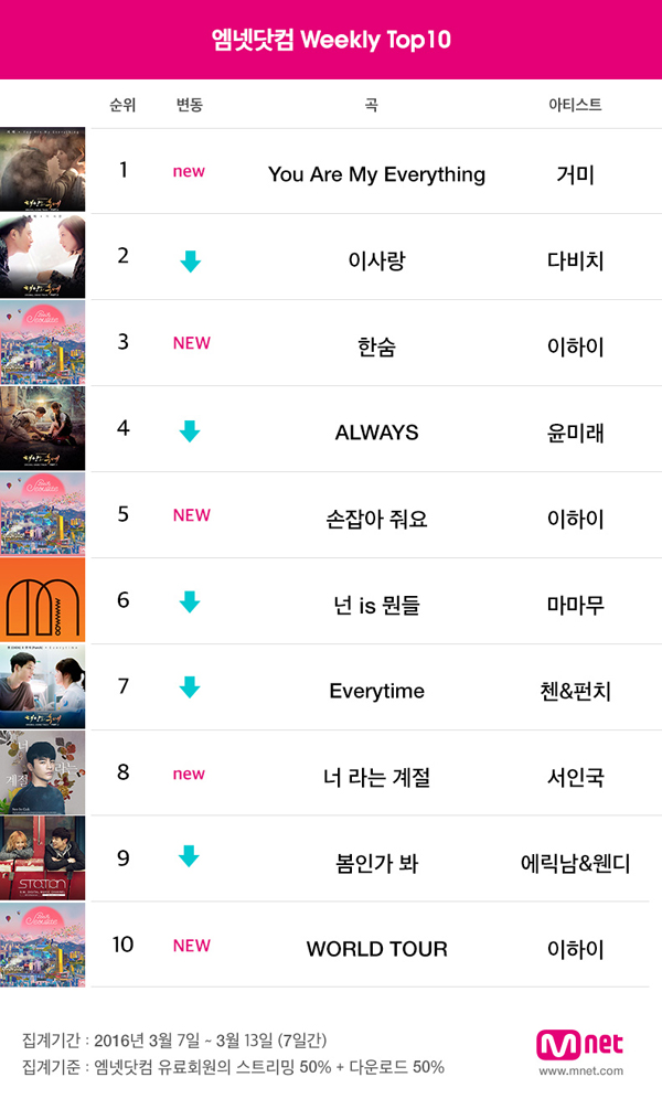 지난 주 1위였던 다비치의 '이 사랑'은 1계단 하락한 주간차트 2위에 안착했다. 또 윤미래의 'Always'는 4위에 자리잡으며 4주째 많은 사랑을 받고 있다. 또한 '태양의 후예' OST Part2의 공개됐던 첸과 펀치의 'Everytime'은 7위에 자리하고 있다.