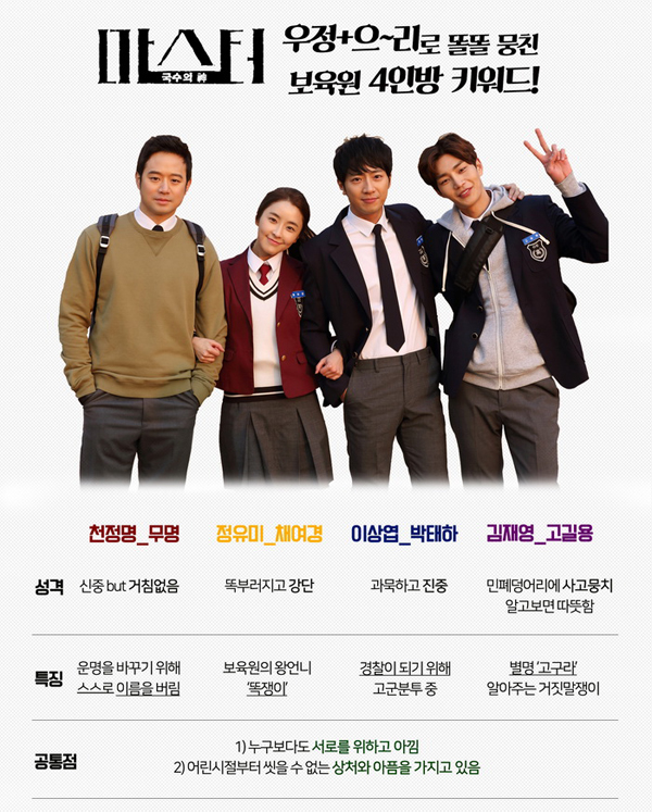 극 중 남다른 우정과 의리로 똘똘뭉친 보육원 4인방으로 활약할 이들은 일곱 살 때부터 각자의 사연을 가지고 보육원에 와 기쁨과 슬픔을 함께 나누며 실제 가족보다 더 가족 같이 자란 사이다.