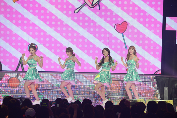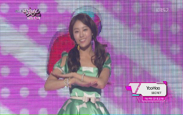 지난 금요일 서울 여의도 KBS 신관 TV스튜디오에서 열린 뮤직뱅크 700회 특집에서 걸그룹 시크릿이 출연하여 '유후'(YooHoo)를 부르고 있다.