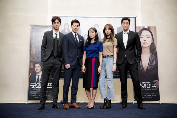 tvN은 28일(목) 오전, 서울 상암동 스탠포드호텔에서 기자간담회를 열고 <굿와이프> 알리기에 나섰다. 이 자리에는 연출을 맡은 이정효 피디와 전도연, 유지태, 윤계상, 김서형, 나나, 이원근 배우가 참석하였다.