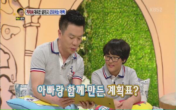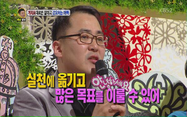 이어 딸의 말에 의하면 친구를 만나러 나가면 계획표를 고치고 나가야 하는 수준인데다가 계획표때문에 맘대로 아플수도 없다며 불만을 토로했다. 또 딸은 "내가 계획표를 만들면 아빠의 맘에 들 때까지 고쳐야 한다. 자로 선을 정확히 긋고 형광펜으로 시간을 구분해야 한다."고 말해 좌중의 혀를 내두르게 할 정도였다.