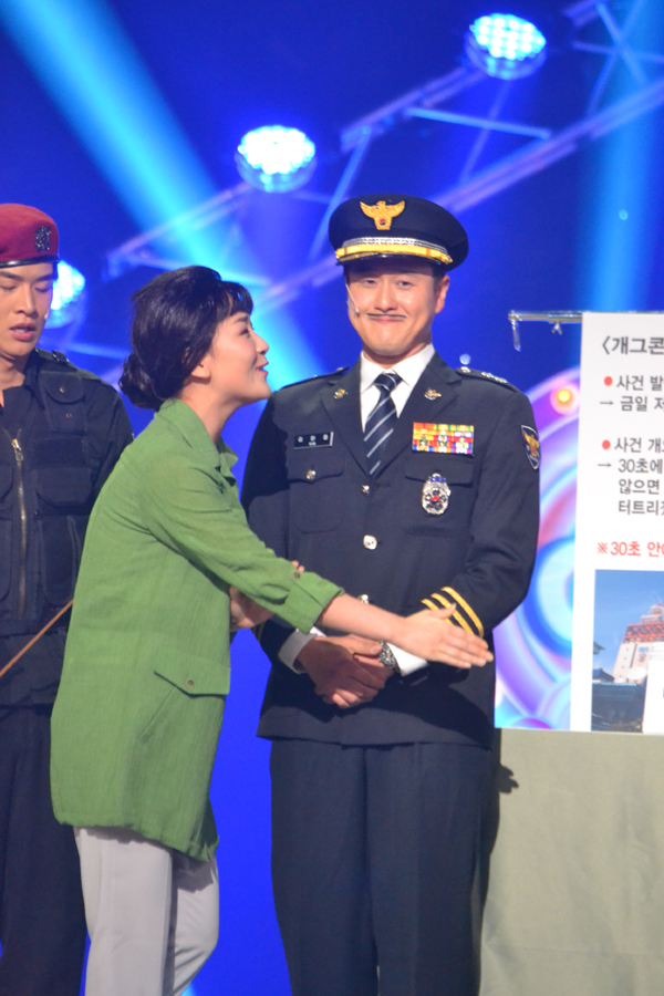 이날 짙은 녹색 상의에 베이지색 바지 패션의 박근혜 대통령으로 깜짝 분장한 사람은 개그우먼 정은선. 정은선은 온화한 미소를 지으며 방청객들에게 손을 흔들어보였다. 특히 정은선은 박근혜와 싱크로율 100% 분장으로 모두를 깜짝 놀라게 했다.