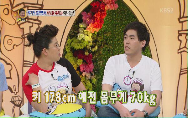 이에 스튜디오에 함께 출연한 여자친구는 "배가 고픈거보다 식탐이 많다. 먹고 싶은 것은 꼭 먹어야 한다."며 심지어 자다가 일어나 새벽에도 빵을 먹은 적이 있다고 얘기했다. 하지만 여자친구는 남자친구가 그것때문에 고민까지 하고 있는 줄은 몰랐다며 이번 기회에 고치겠다고 반성하는 태도를 보여 훈훈함을 자아냈다.