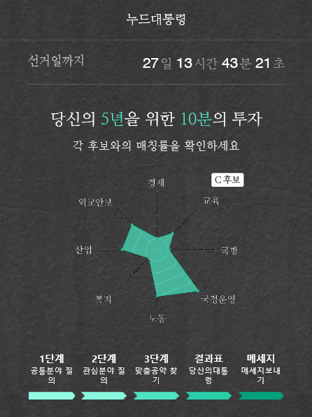 ‘누드 대통령’은 2017 대선 후보들의 공약과 정책을 익명으로 보여줘서 사용자가 선호하는 것을 선택하면 각 후보들의 매칭률 순위를 보여준다. 경제, 교육, 산업 등 상세 분류별 매칭률도 보여주며, 나이, 성별, 직업에 맞는 부동산 정책, 일자리 창출 등 상세 항목에 대한 공약에 대한 비교도 해준다.