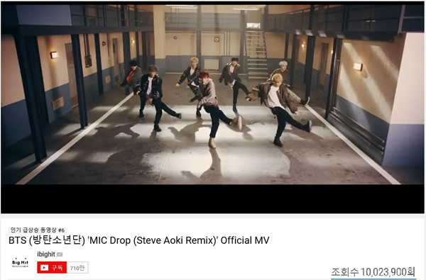 그룹 방탄소년단의 신곡 ‘MIC Drop’ 리믹스 뮤직비디오가 유튜브 조회수 1000만 건을 돌파했다.