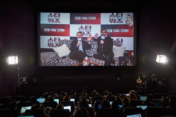 12월 14일 전 세계 동시 개봉하는 <스타워즈: 라스트 제다이>(Star Wars: The Last Jedi)의 스페셜 풋티지 상영회와 라이브 컨퍼런스 행사가 7일 서울 왕십리 CGV에서 성황리에 개최됐다. 현장을 찾은 취재진들로 행사장은 빈자리를 찾을 수 없을 정도로 가득 찬 가운데 영화에 대한 기대와 감독과 배우에 대한 관심을 증명했다.