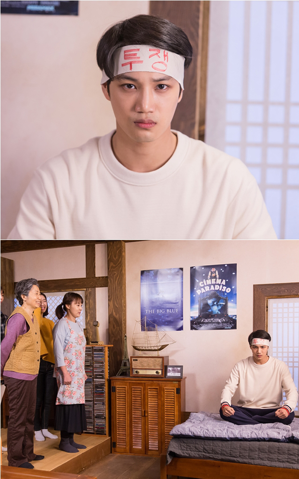 공개된 사진 속 카이는 ‘투쟁’이라고 적힌 머리띠를 두르고 결연한 표정으로 침대에 앉아 있다. 강렬한 눈빛으로 주먹을 꼭 쥐고 구호를 외치는 카이의 모습이 사뭇 비장해 보이지만 그를 지켜보고 서 있는 가족들은 그런 카이의 모습이 오히려 귀엽다는 듯 웃음을 감추지 못하고 있다.