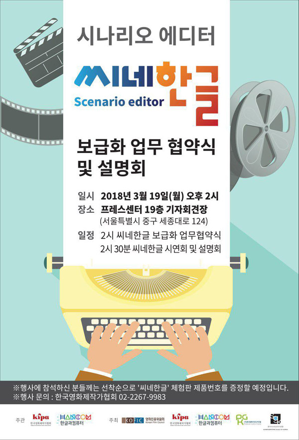 19일 오후, 프레스센터에서는 한국영화제작가협회, 한국영화프로듀서조합, 한국시나리오작가조합, 한글과컴퓨터 그리고 영화진흥위원회 관계자가 참석한 가운데 '씨네한글 보급화를 위한 업무협약'을 맺고 '씨네한글'을 소개 시연하는 자리가 마련되었다.