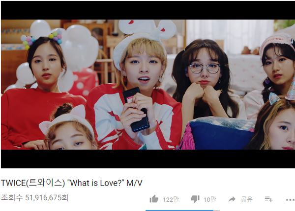 트와이스(TWICE)가 '왓 이즈 러브?(What is Love?)' 뮤직비디오로 K팝 걸그룹 사상 최단기간 5000만뷰를 돌파했다.