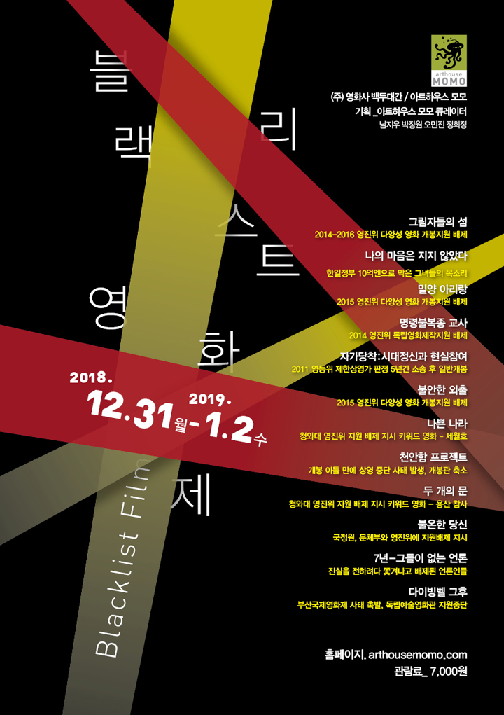 아트하우스 모모는 각기 다른 이유로 권력에 의해 낙인찍혔으며 부정한 방법으로 배제당한 영화들을 다시 스크린으로 불러온다. 2018년 12월 31일(월)부터 2019년 1월 2 일(수)까지 이화여자대학교 안에 자리한 예술영화전용관 아트하우스 모모에서 개최되는 <블랙리스트 영화제>는 이명박-박근혜 정부의 블랙리스트를 기점으로, 지금껏 한국 영화계가 걸어왔고 앞으로 걸어 나갈 길을 서로에게 묻고자 한다.