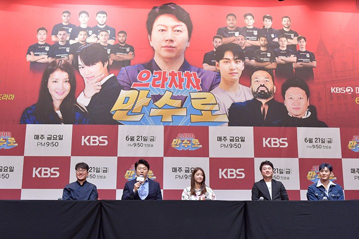 21일 오후, 서울 구로구 라마다호텔신도림 그랜드볼룸에서는 오늘 밤 첫 방송되는 KBS 2TV 새 예능프로그램 <으라차차 만수로>의 제작발표회가 열렸다. 이날 행사에는 ‘첼시 로버스’ 팀의 구단주 김수로를 비롯해 그와 함께 팀을 이끌어갈 이시영, 박문성, 백호(뉴이스트)가 참석했다. 이들은 선수가 아니다. 구단 운영을 책임질 이사들이다. 이들과 함께 카이(엑소)와 럭키 도 김수로와 호흡을 맞춘다.