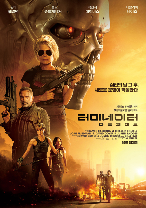 <터미네이터 2>의 오리지널리티를 잇는 <터미네이터: 다크 페이트>가 10월 30일 개봉과 함께 압도적인 분위기의 메인 포스터를 최초 공개했다. <터미네이터: 다크 페이트>는 심판의 날 그 후, 미래에서 온 ‘슈퍼 솔져’ 그레이스 VS 최첨단 기술력으로 무장한 최강의 적 터미네이터 ‘Rev-9’이 벌이는 새로운 운명의 격돌을 그린 액션 블록버스터.