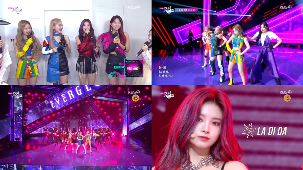 에버글로우(이유, 시현, 미아, 온다, 아샤, 이런)는 25일 오후 방송된 KBS 2TV ‘뮤직뱅크’에 출연해 두 번째 미니앨범 ‘-77.82X-78.29’의 수록곡 ‘언터쳐블(UNTOUCHABLE)’과 타이틀곡 ‘라 디 다(LA DI DA)’ 무대를 펼쳤다.