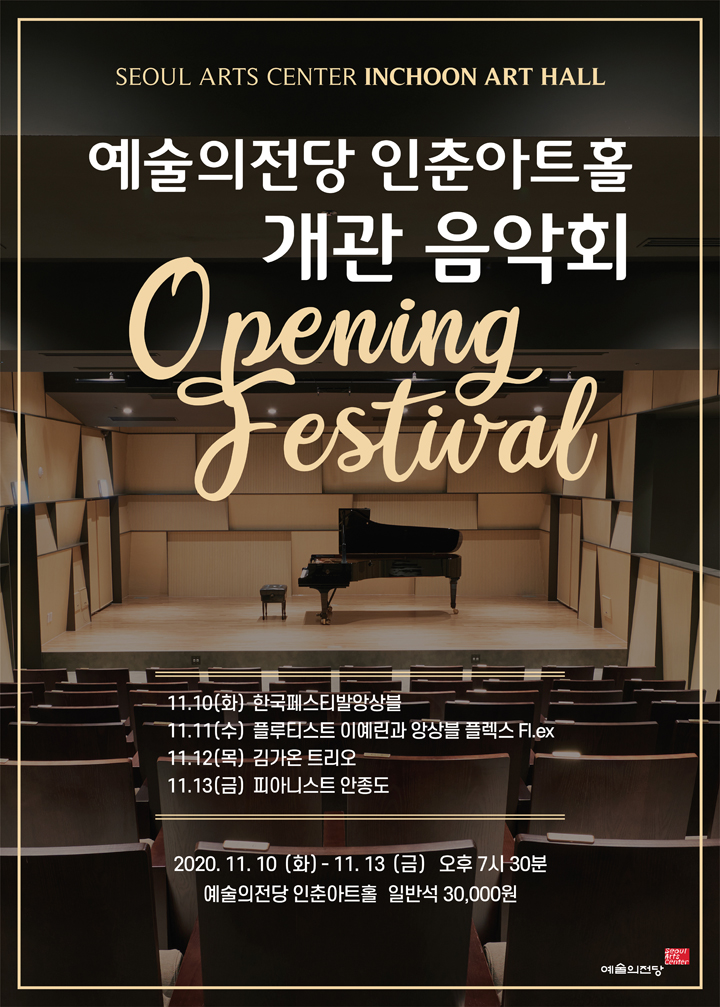 당초 9월말로 예정했던 개관 시기가 코로나19로 연기된 끝에 이번에 드디어 관객과 만나게 되는 <인춘아트홀 개관 음악회>는 11월 10일(화) 한국페스티발앙상블을 시작으로, 플루티스트 이예린과 앙상블 플렉스 Fl.ex, 김가온 재즈 트리오, 피아니스트 안종도의 리사이틀 까지 국내에서 활발히 활동 중인 연주자들의 프로그램으로 준비되었다. (KBS미디어 박재환)