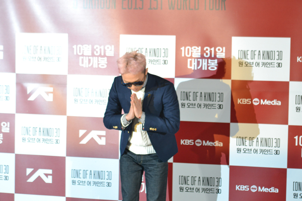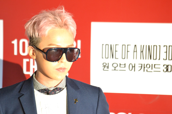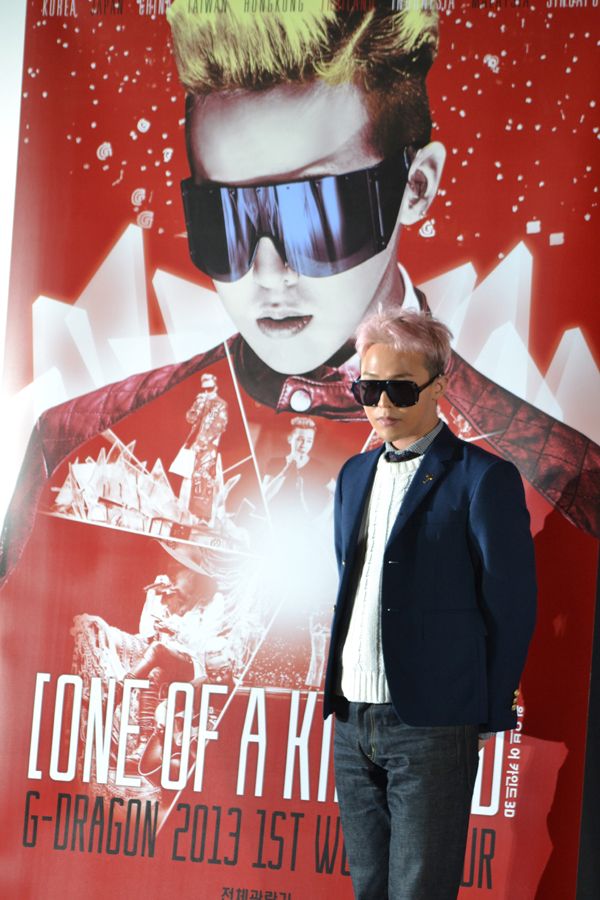 가수 지드래곤(본명 권지용)이 어제 오후 서울 삼성동 코엑스 메가박스에서 열린 <원 오브 어 카인드( One Of A Kind) 3D>(감독 손석, 정치영) 언론시사회에 참석해 무대 인사를 하고 있다. 이 영화는 지드래곤의 첫 번째 월드투어 실황을 3D(입체영상)로 담은 영화이다.