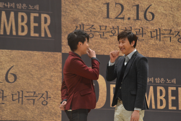 기자간담회에 이어 ‘디셈버’의 하이라이트 시연이 있었다. 이날 김준수는 김광석의 미발표곡 ‘12월’을, 박건형은 ‘너무 아픈 사랑은 사랑이 아니었음을’을 소름끼치도록 불러 객석으로부터 우레 같은 박수를 받았다.