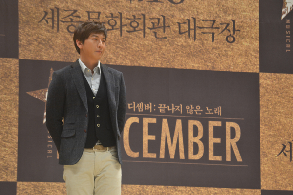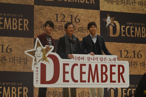 어제 오후 2시, 세종문화회관 대강당에서는 뮤지컬 ‘디셈버: 끝나지 않는 노래’의 제작발표회가 열렸다. 통상 뮤지컬 제작발표회는 언론매체만을 대상으로 펼쳐진다. 그런데 이날의 제작발표회는 특별했다. 세종문화회관 대강당 2층에는 이 뮤지컬에 관심이 높은 팬들이 특별히 참석하여 제작발표회 전 과정을 지켜볼 수 있었다. 제작발표회장에는 제작사 ‘NEW’의 김우택 대표, 세종문화회관 박인배 사장, 장진 감독을 비롯하여, 배우 김준수, 박건형, 오소연, 김예원, 김슬기 등이 참석하였다.