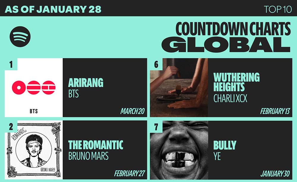 ‘ARIRANG’은 스포티파이 ‘카운트다운 차트 글로벌’(Countdown Charts Global)에서도 2주 연속(1월 21일, 28일 기준) 1위를 차지했다. 해당 차트는 발매를 앞둔 앨범과 싱글의 사전 저장 수치를 집계하는 지표다. 글로벌 음악팬들의 기대치를 가늠할 수 있는 척도로 통한다.