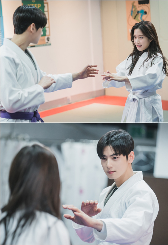 공개된 스틸에는 주짓수 도복을 갖춰 입고 마주 선 두 사람의 모습이 담겨있다. 문가영은 처음 접해보는 주짓수에 신이 난 듯 아이처럼 해맑은 표정을 짓고 있고, 차은우는 그런 문가영이 귀여운지 미소를 머금은 표정이다.