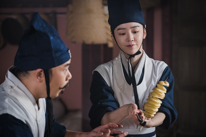 그런 가운데 공개된 사진 속 수라간 숙수로 변신한 김소용의 모습이 호기심을 자극한다. 매번 조선궁궐내에 처음 선보이는 레시피로 모두를 놀라게 했던 김소용. 이번 역시 듣도 보도 못한 요리 필살기를 꺼내 들어 대령숙수 만복(김인권 분)의 눈을 휘둥그레지게 만들었다. 이번에 중전이 내놓은 요리는 바로 회오리 감자. 난생처음 보는 감자의 화려한 변신에 만복이 놀란다.