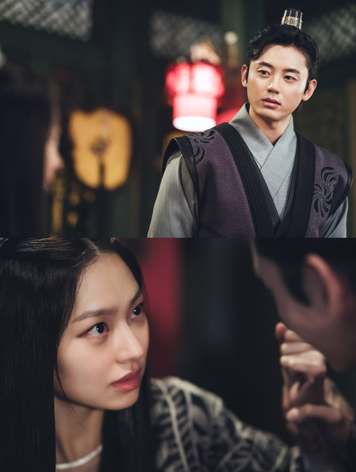 이런 가운데 '달이 뜨는 강'을 더욱 흥미진진하게 만들어줄 고건(이지훈 분)과 해모용(최유화 분)의 투샷 스틸컷이 공개됐다. 앞서 공개된 평강과 온달의 케미와는 180도 다른 위험한 텐션이 이목을 집중시킨다.