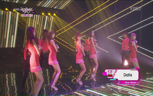 오늘 오후 6시 10분부터 서울 여의도 KBS신관 스튜디오에서 생방송으로 진행된 2월 둘째 주 뮤직뱅크(687회)에서 나인뮤지스가 출연하여 '돌스'(Dolls)를 불렀다.