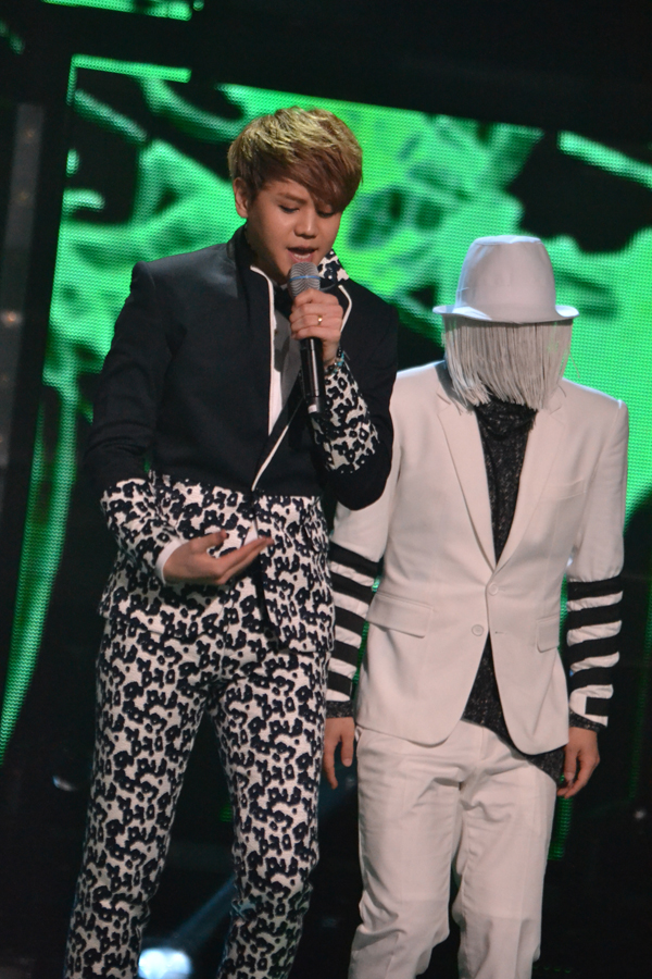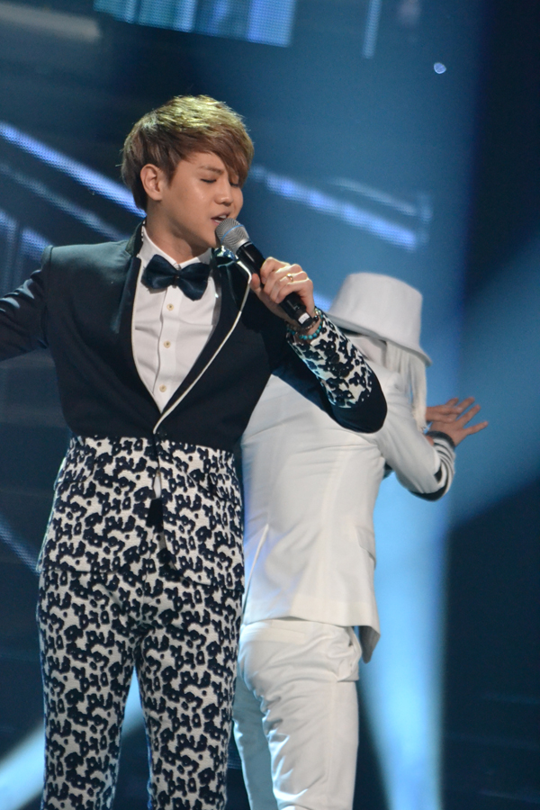 어제 방송된 1월 첫째 주 뮤직뱅크에서 1위 후보에 오른 비스트의 양요섭이 '카페인'을 부르고 있다. 이날 뮤직뱅크에서는 싸이의 '강남스타일'이 1위 트로피를 차지했다.