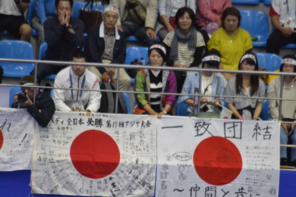 오늘(29일) 오전, 비가 내리는 가운데 송도 글로벌캠퍼스 카바디경기장에서 열린 일본과 태국의 카바디 여자예선 경기에 응원나온 일본인 관람객. 경기 결과는 일본이 태국에 18대 20으로 졌다.