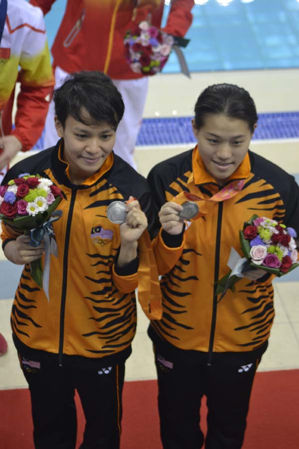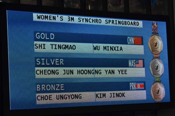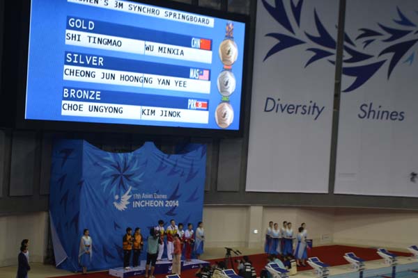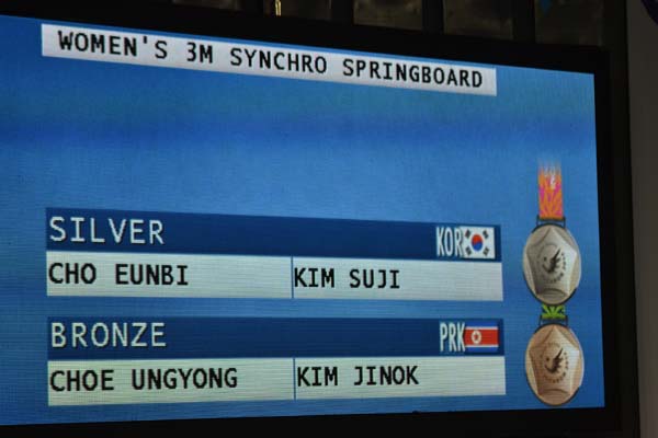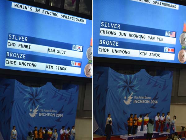 오늘(29일) 오후, 인천 문학박태환수영장에서 열린 여자 싱크로나이즈 3m 스프링보드 결승전이 끝나고 시상식이 진행될 때 장내 전광판에 은메달 수상자가 잘못 나오는 사고가 일어났다. 이날 결승전에서 중국의 쓰팅마오-우밍샤 조가 금메달을, 말레이시아의 청준홍-응얀이 조가 은메달을, 그리고 북한의 전은영-김진옥이 동메달을 차지했다. 한국의 조은비와 김수지는 4위에 머물렀다. 하지만 시상식에서 동메달 시상이 끝나고 은메달을 시상할 때 전광판에는 말레이시아 선수가 아닌 4위를 차지한 한국선수가 나타난 것이다. 곧 정정되었다. 국제대회 운영에 있어서 옥의 티이지만. 마음만은 은메달~