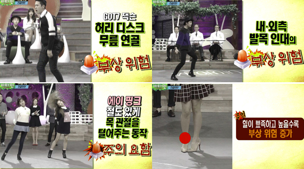 이들의 안무를 지켜 본 김학선 교수는 "잭슨은 덤블링하고 점프를 하는데 착지할 때 허리 디스크하고 무릎 연골에 부상위험이 높다. 일훈의 경우는 무릎을 안에 넣고 비트는 동작이 있는데, 내외측부 인대가 다칠 수 있다"고 진단했다. 이어 "걸그룹은 절도 있게 목을 꺾는데 갑자기 그러면 인대가 다칠 수 있다. 그래서 하기 전에 스트레칭을 많이 해주고 특히, 하이힐을 신고 발목을 삐끗하거나 이러면 굉장히 다칠 위험이 많다"고 전했다.