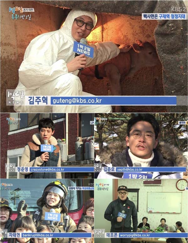 공개된 멤버들의 기자 이메일에는 ‘1박 2일’에서 보여지는 각자의 캐릭터가 그대로 녹아있었다. ‘구탱이형’ 김주혁의 아이디는 ‘guteng’, ‘얍쓰’ 김준호의 아이디는 ‘yapth’, ‘근심돼지’ 데프콘의 아이디는 ‘worrypig’, ‘신난 바보’ 김종민의 아이디는 ‘happybabo’로 ‘1박 2일’에서 사용하는 멤버들의 별명을 영어로 바꾸어 놓아 웃음을 자아냈다.