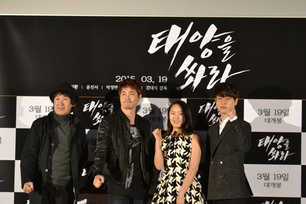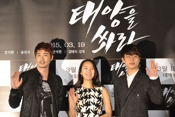 그 끝이 빤히 보이는 ‘아메리칸 드림’. 미국까지 흘러간 세 남녀의 잔인한 운명을 만나게 되는 감성 느와르 ‘태양을 쏴라’가 마침내 기자시사회를 갖고 영화 팬을 찾는다. 지난 9일(월) 오전, 서울 자양동 롯데시네마 건대입구에서는 ‘태양을 쏴라’의 김태식 감독과 주연배우 강지환, 윤진서, 박정민이 참석한 가운데 기자/배급시사회와 함께 기자간담회가 열렸다.
