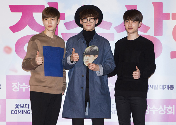 지난 1일 서울 영등포CGV에서 열린 영화 '장수상회' VIP시사회에 참석한 아이돌그룹 엑소(EXO)의 멤버 수호,첸,디오가 포토월에서 사진기자들을 위해 포즈를 취하고 있다. '장수상회'에는 엑소의 찬열이 출연한다.